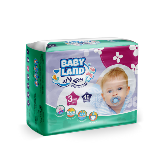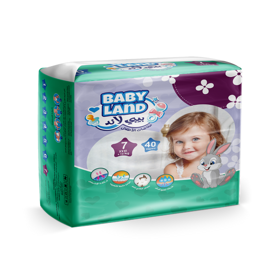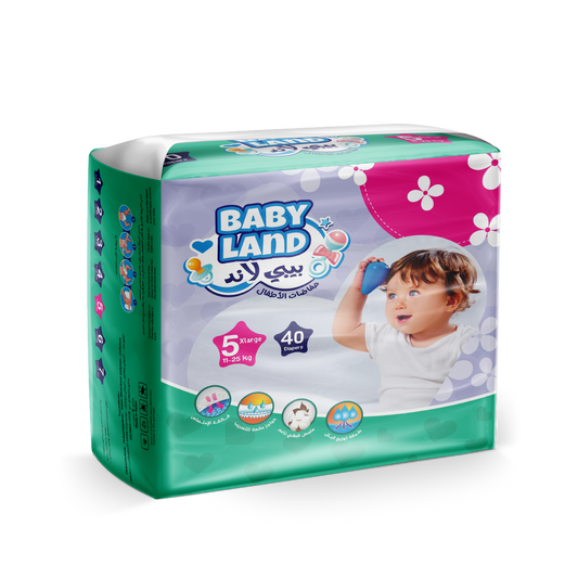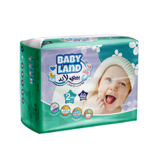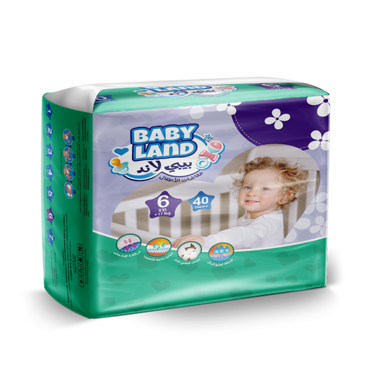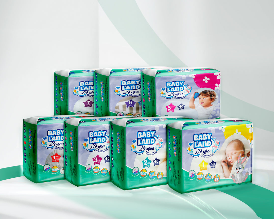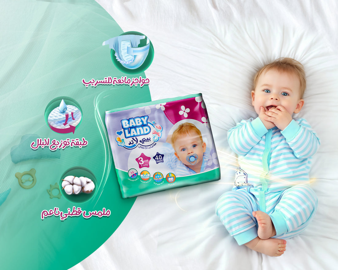 حفاضات بيبي لاند تحتوي على طبقة داخلية فائقة الامتصاص، تمتص البلل بسرعة وتساعد في الحفاظ على بشرة الطفل جافة ومرتاحة لأطول فترة ممكنة